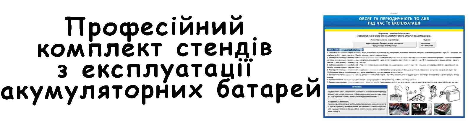 Професійний комплект стендів з експлуатації акумуляторних батарей зазвичай включає декілька тематичних інформаційних блоків формату 110×80 см, які комплексно охоплюють всі етапи роботи з АКБ: