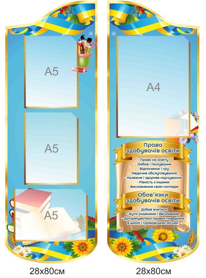 Посередині стенду передбачені кишені формату А4 і А5, куди зручно вставляти змінну інформацію — оголошення, тематичні матеріали, дитячі малюнки, фотографії чи роботи учнів.
