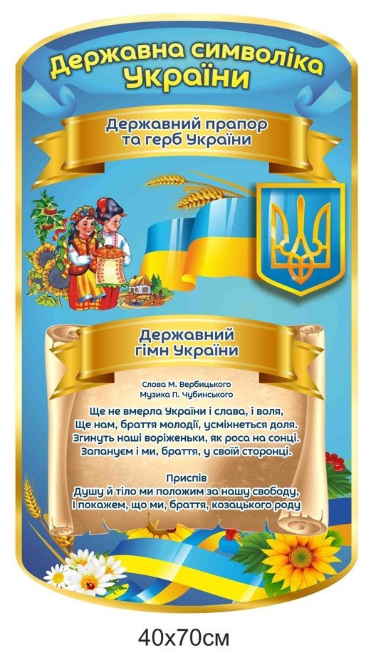 Таке оформлення допомагає учням щодня бачити, усвідомлювати та відчувати важливість національної ідентичності. Тексти й зображення виконані у привабливих синьо-жовтих кольорах, що створюють атмосферу гордості й урочистості.