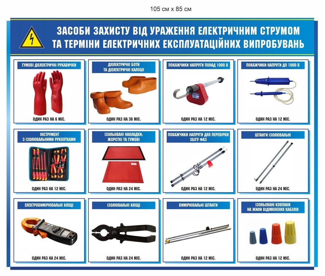 Sнформаційний стенд демонструє повний перелік засобів індивідуального електрозахисту, які використовуються під час роботи з електроустановками. На ньому зображено: