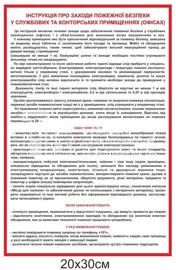 Інструкція про заходи пожежної безпеки у службових та конторських приміщеннях - купити на stend-tb.com