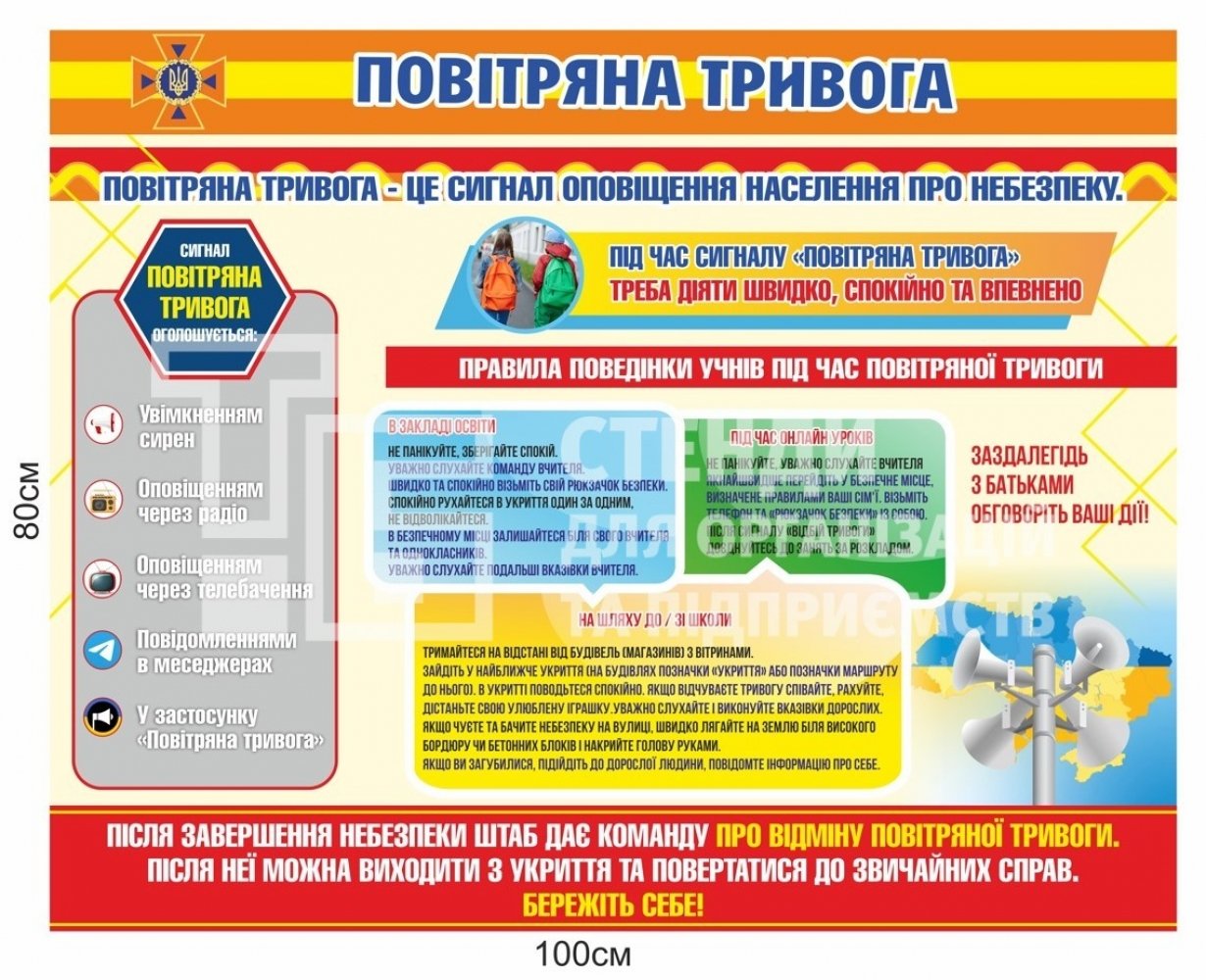 Стенд "Правила поведінки учнів під час повітряної тривоги" - купити на stend-tb.com.