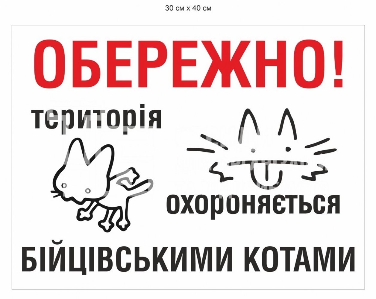 Табличка з приколом "Територія охороняється бійцівськими котами" - купити на stend-tb.com.