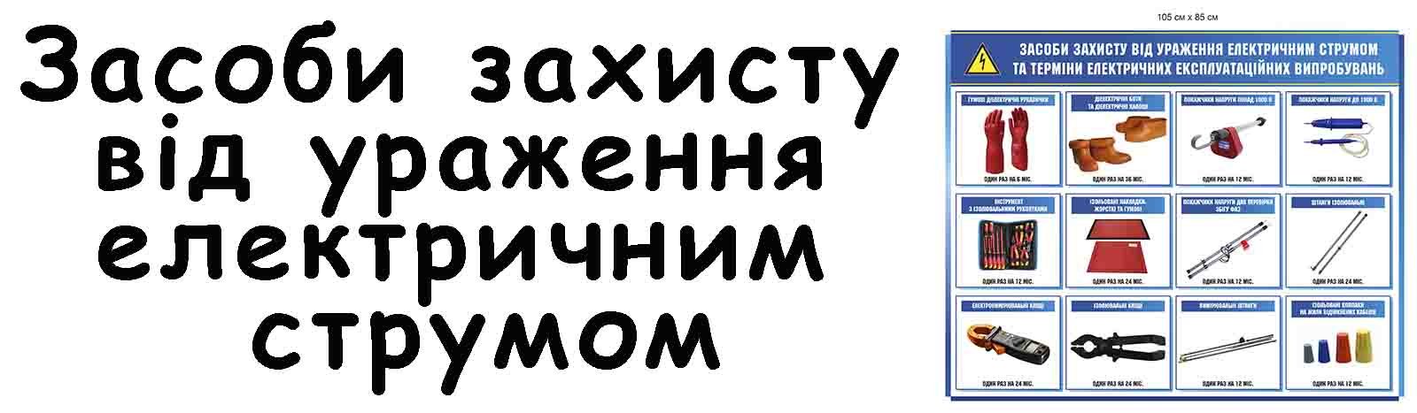 Sнформаційний стенд демонструє повний перелік засобів індивідуального електрозахисту, які використовуються під час роботи з електроустановками. На ньому зображено: