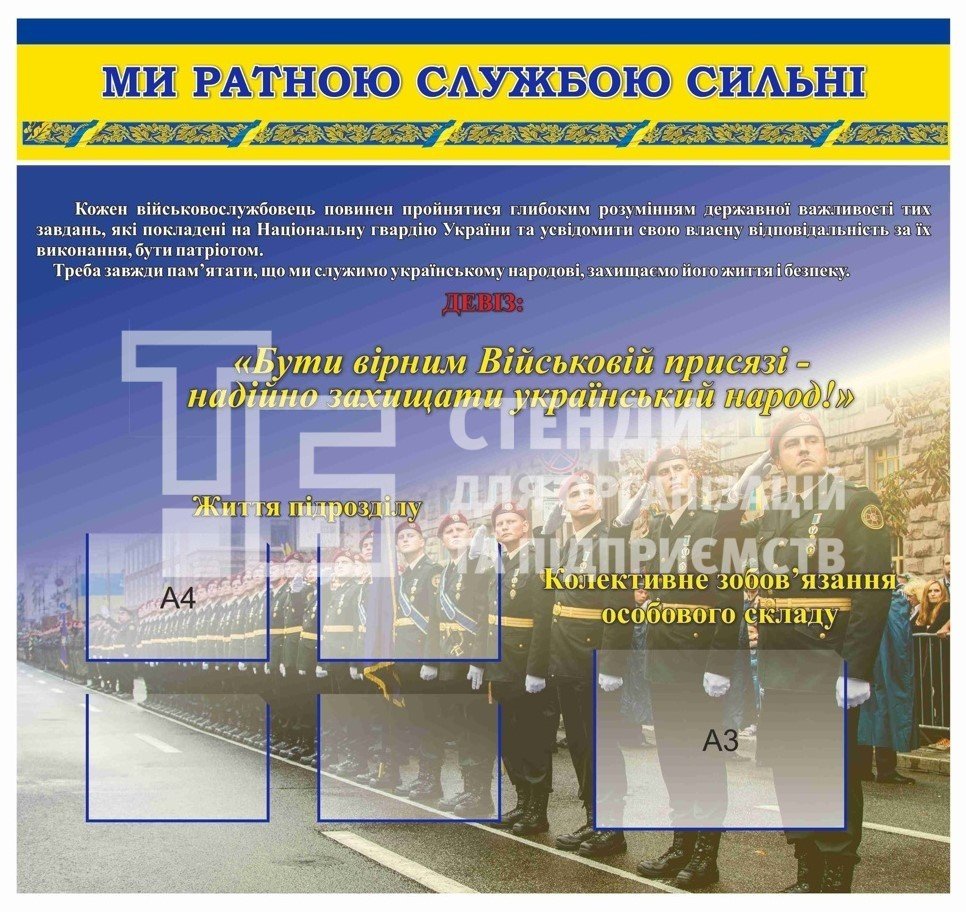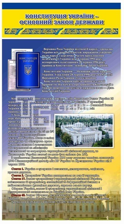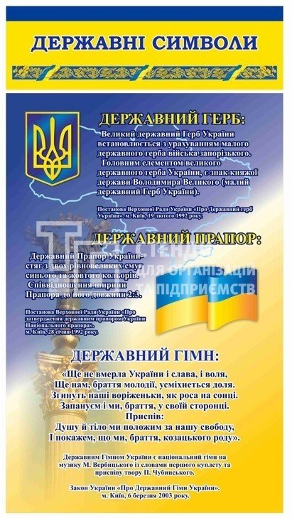 Усі представленні стенди виготовлені з високоякісного ПВХ (пластику) товщиною 3мм, який вкривається плівкою з повнокольоровим друком. «Кармани» в свою чергу з прозорого пластику ПВХ товщиною 0.4мм.