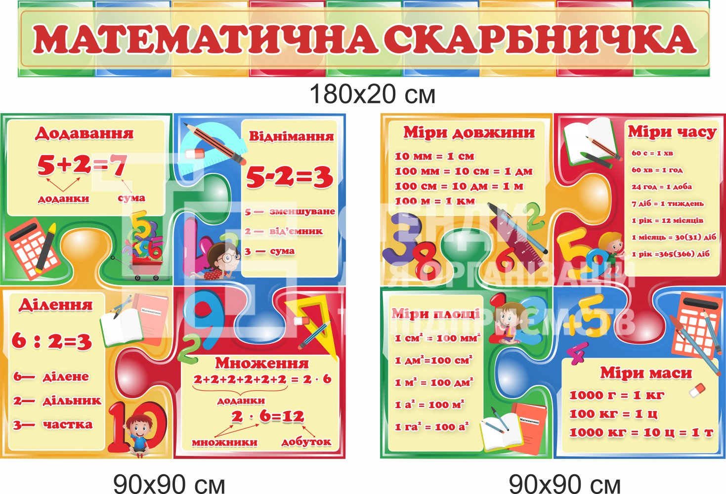 Комплект стендів з математики для початкових класів. У комплекті 2 стенда та стрічка.