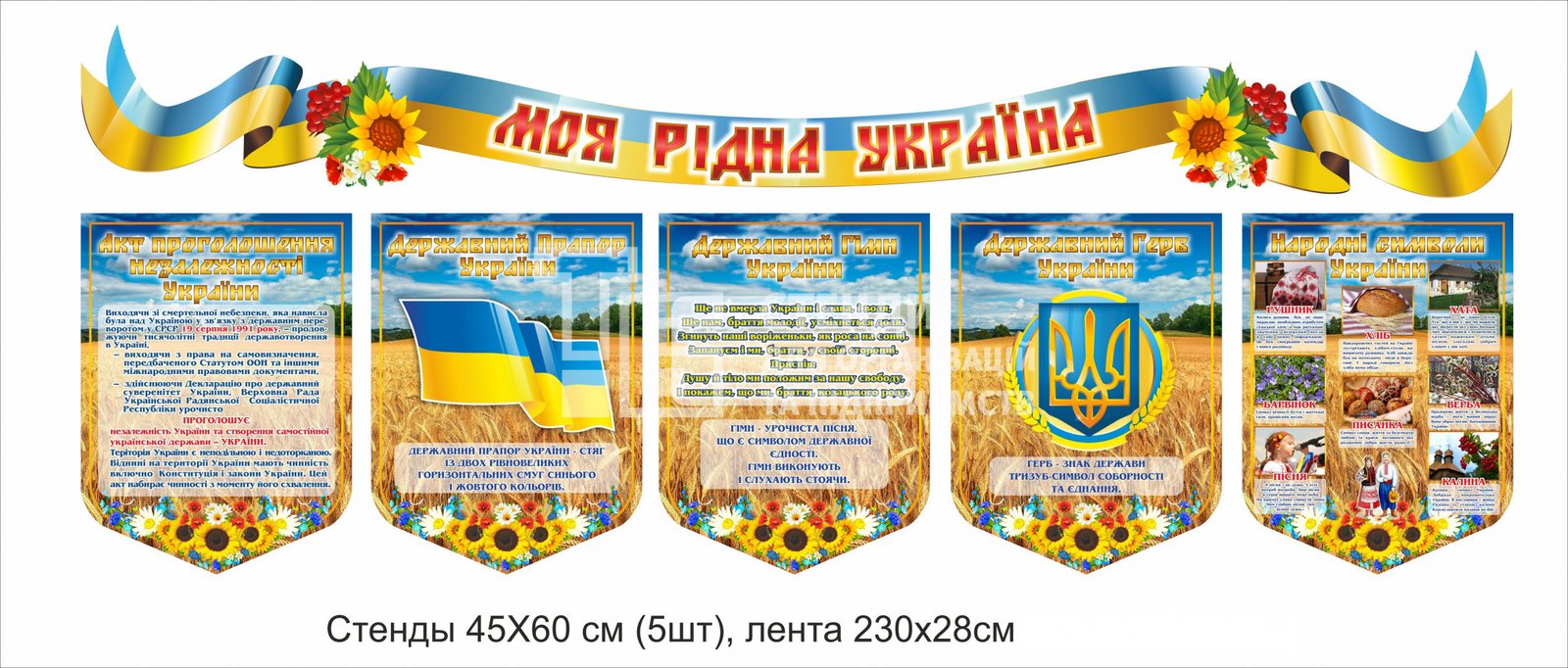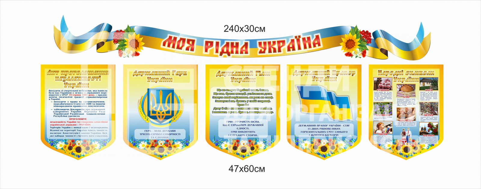 Комплект стендів "Україна моя рідна ". Включає стрічку та 5 стендів з малюнками державних символів та народних символів України.