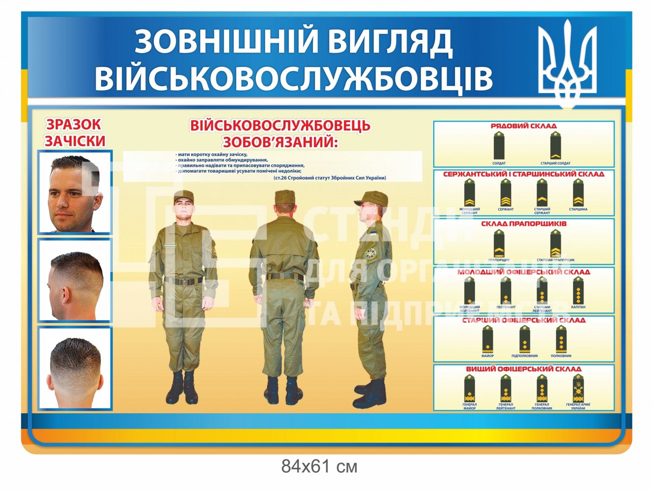 Стенд із зображенням форми, звань, зачіски військовослужбовця.