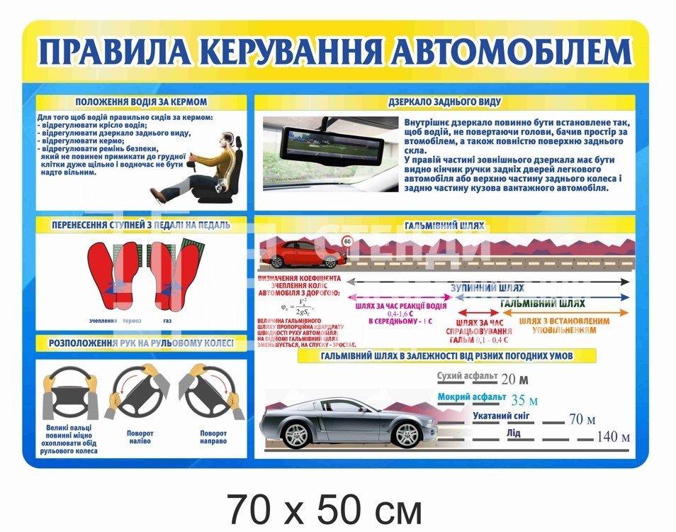 Стенд “Правила керування автомобілем” виготовляють у різних розмірах і варіантах: на ПВХ, пластику, композитній основі або з ламінуванням. Він стійкий до зношування, легко кріпиться на стіну та служить довгі роки.