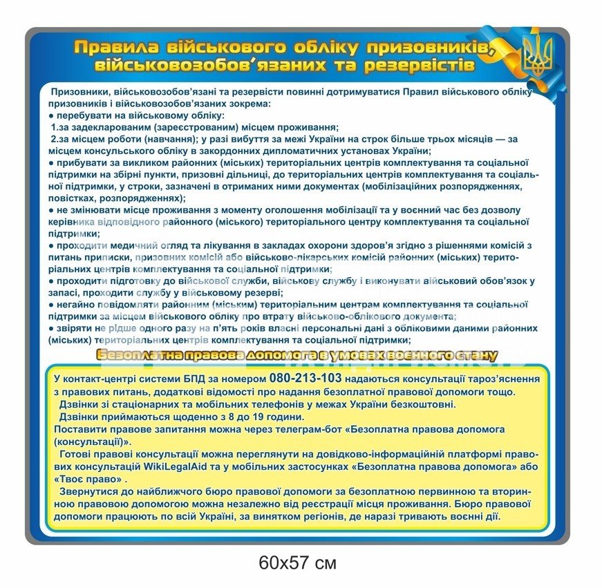 Стенд "Правила військового обліку призовників, військовозобов'язаних та резервістів" - купити на stend-tb.com.