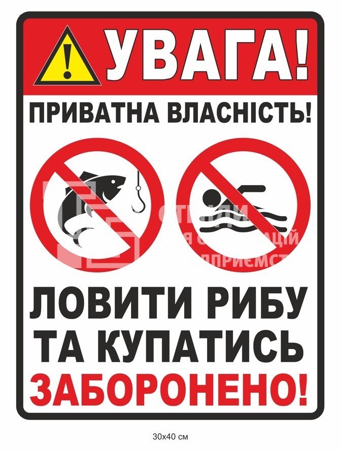 Табличка "Увага! Приватна власність! Ловити рибу та купатись заборонено" - купити на stend-tb.com.
